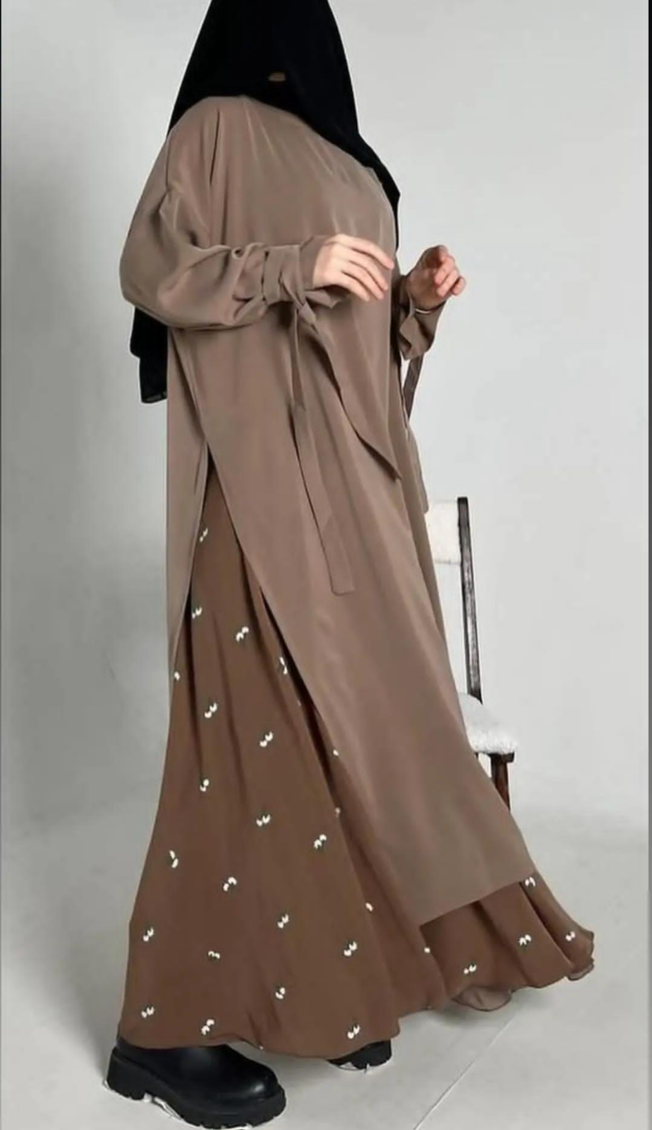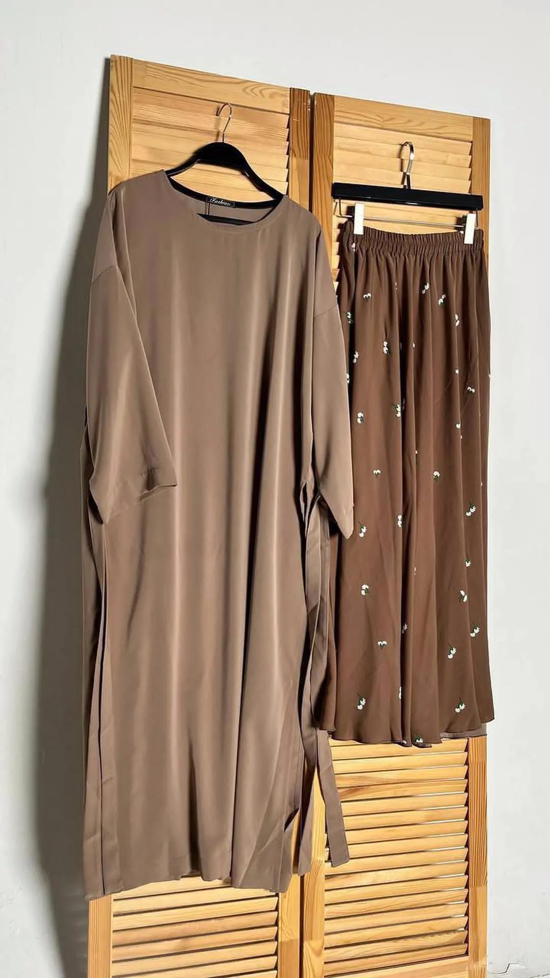 Cet ensemble se compose d'une tunique fluide et d'une jupe avec de petites fleurs. Les deux pièces sont légères et ne se froissent pas facilement, ce qui les rend pratiques. La tunique a une coupe ample et confortable, et la jupe est parfaite pour un look à la fois décontracté et élégant. Elle s'adapte bien à la taille standard, idéale pour le quotidien ou les sorties.